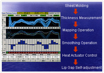 The actuator (heat bolt type) installed on the T-Die tip operates according to the measured result, and controls so that the film thickness becomes uniform.